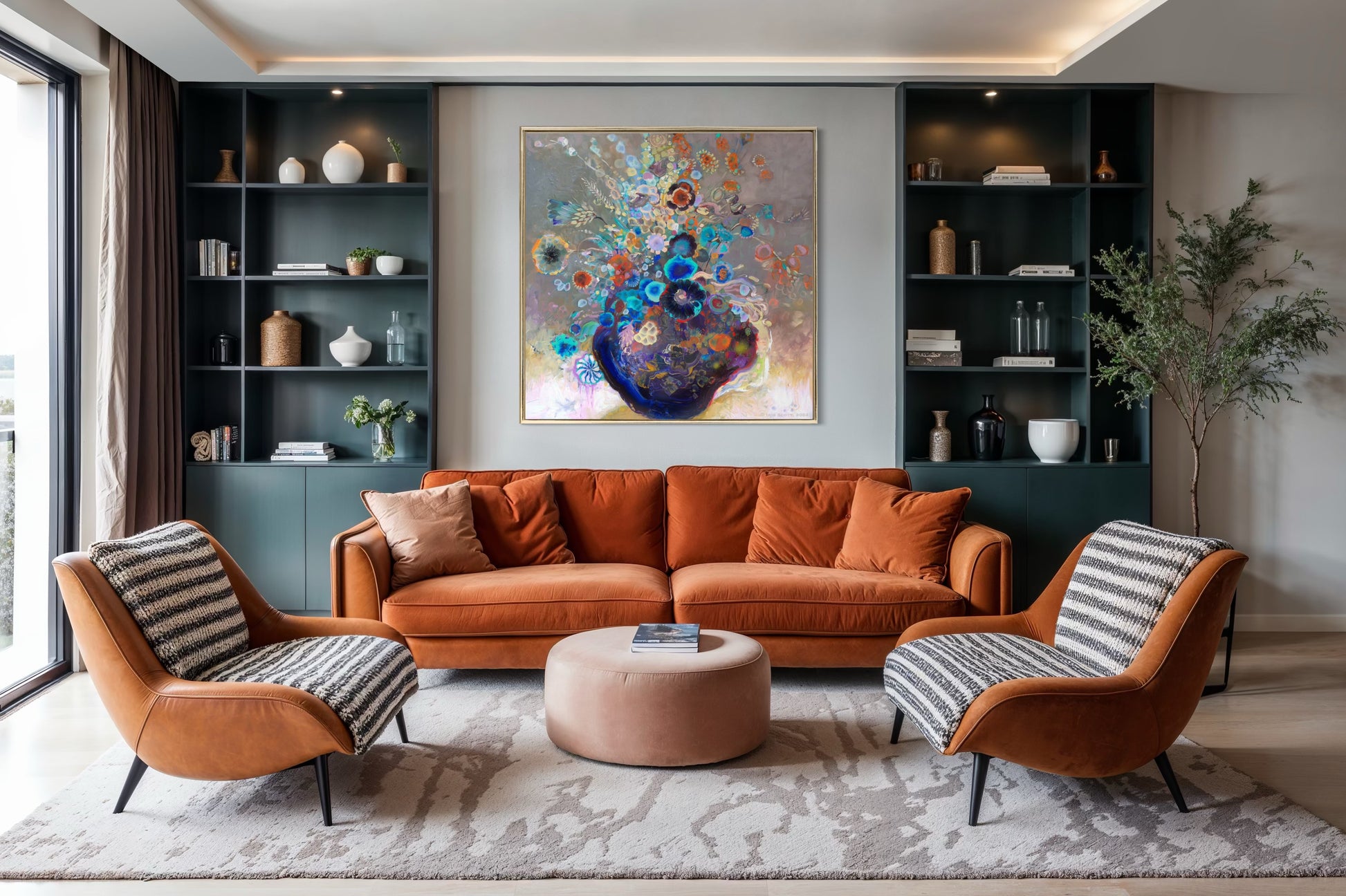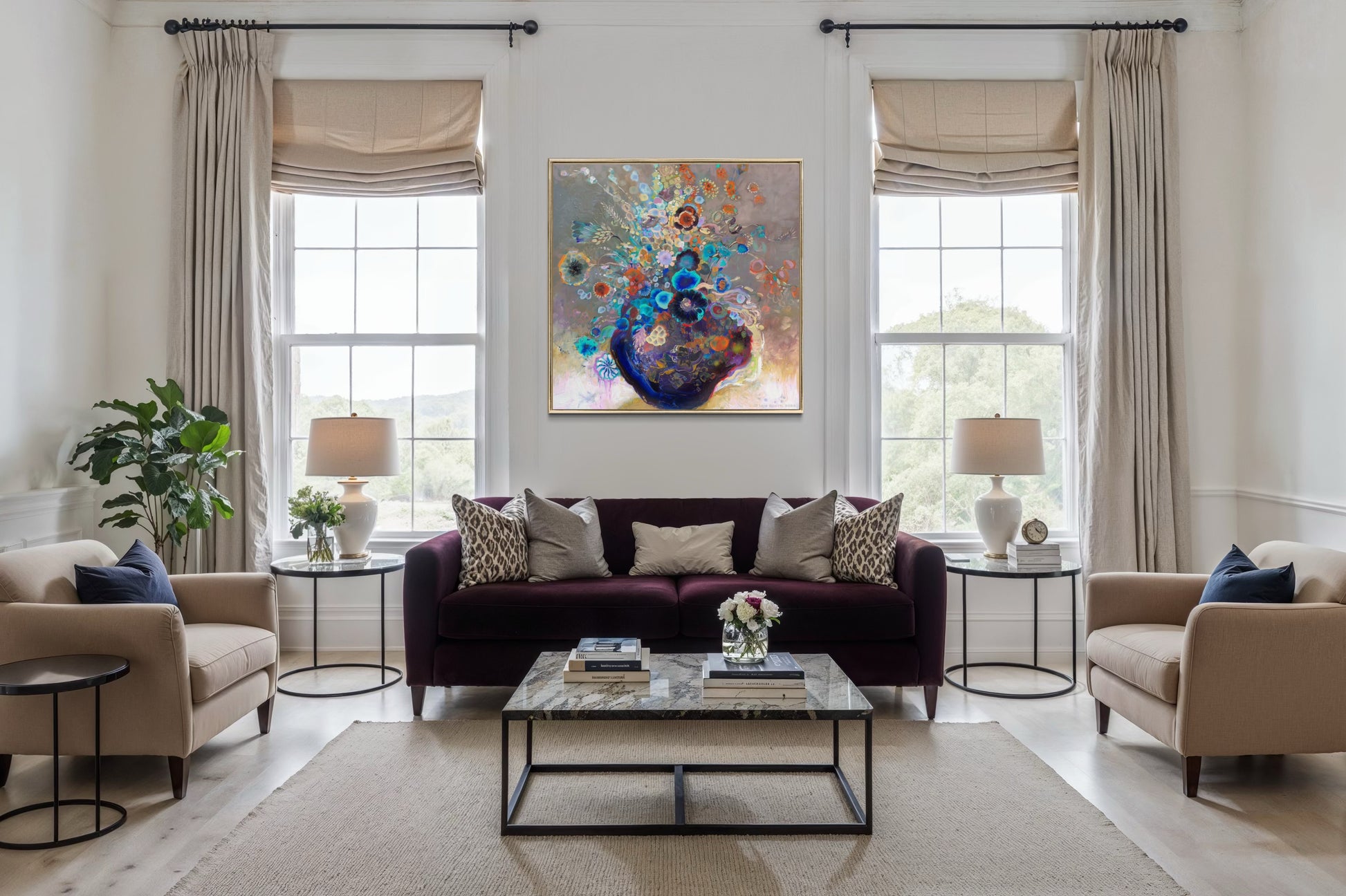 Ice-blue blossoms and velvety black petunias draw the focal point, their presence glowing neon. Long-stemmed orange foxgloves stretch to the edges, while whispers of baby’s breath add a tender echo. A blue-and-white striped flower drips with purple, spinning like a cosmic breath mint, blurring the line between what flowers can and cannot do. The elegant gray background shimmers like silver oily clay, adding intrigue to a simple wall. The artist has conjured this floral from her memory, relying on instinct and not life. She worries not about what flowers look like, she has fun with the piece, and pulls inspiration from Picasso.