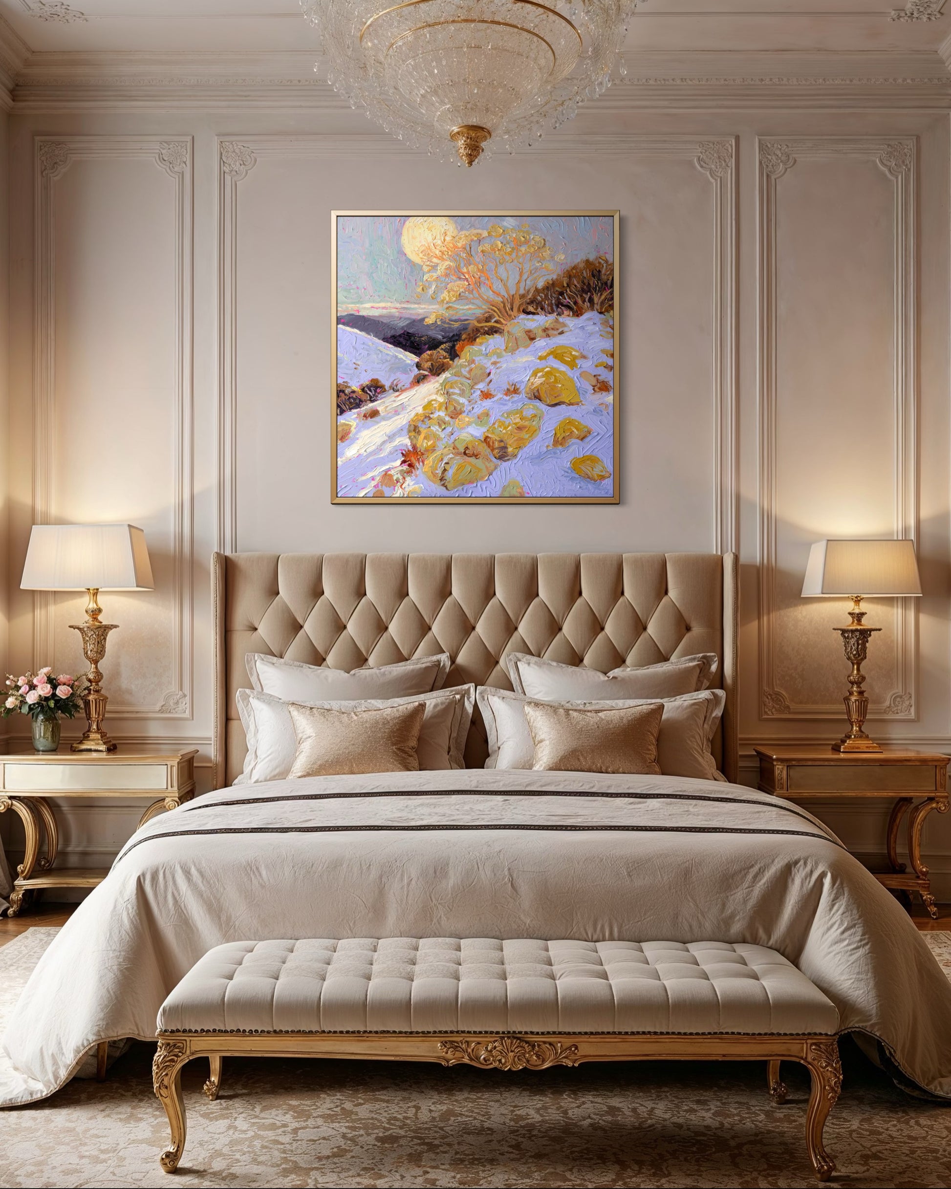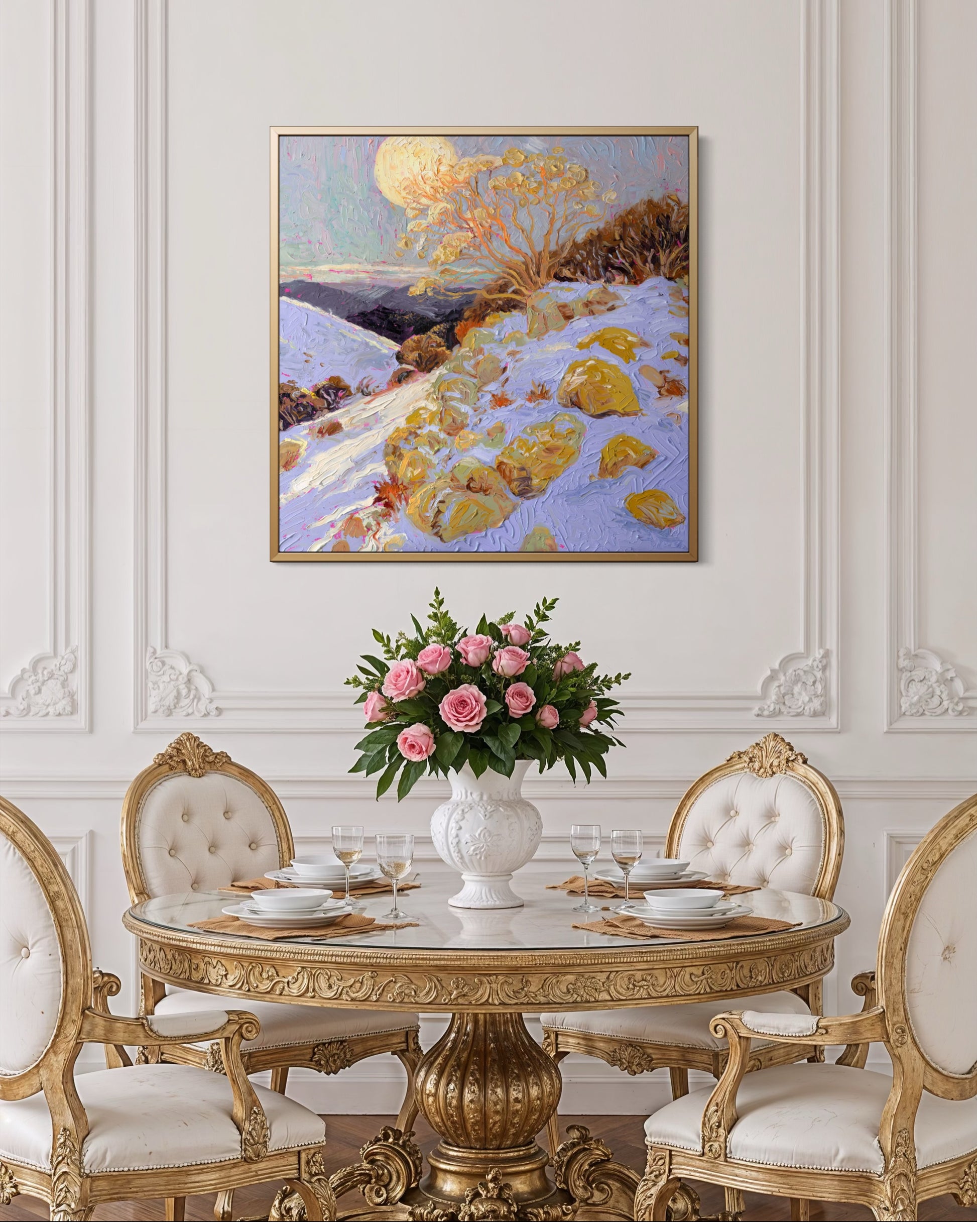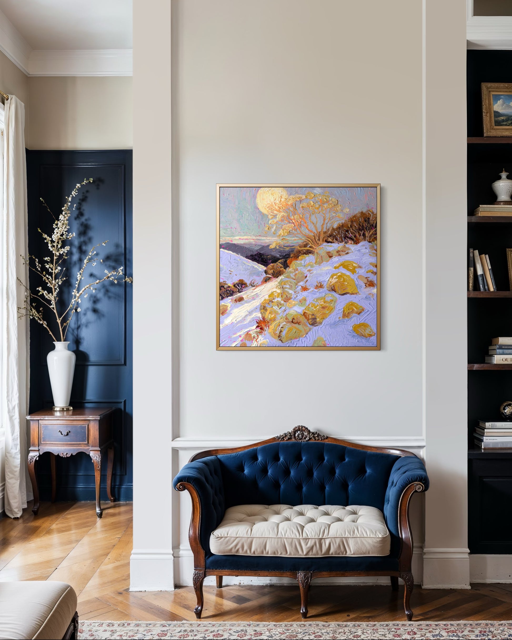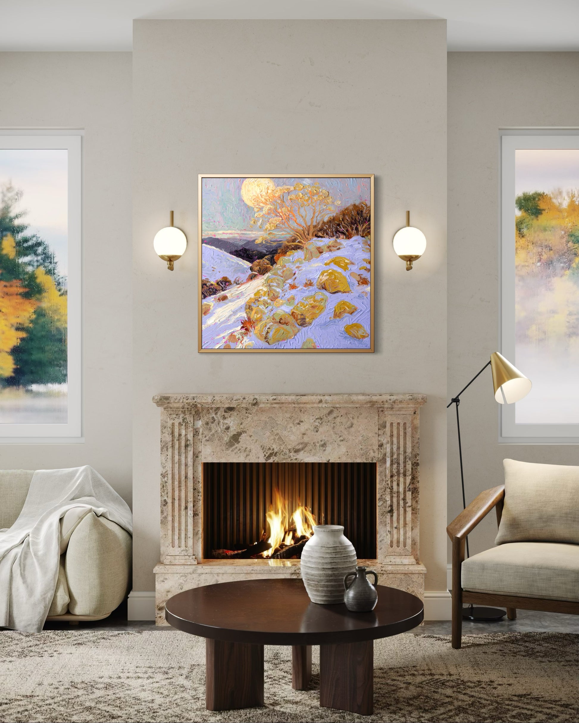 Finger-painted in oils, Iris conjures her signature symphony of texture and glow. Step closer, and you can almost feel the snow crest against your shins. The moonlight calls you inward, toward the warmth of the moon-baked snow that waits just beyond the edge of the canvas.
