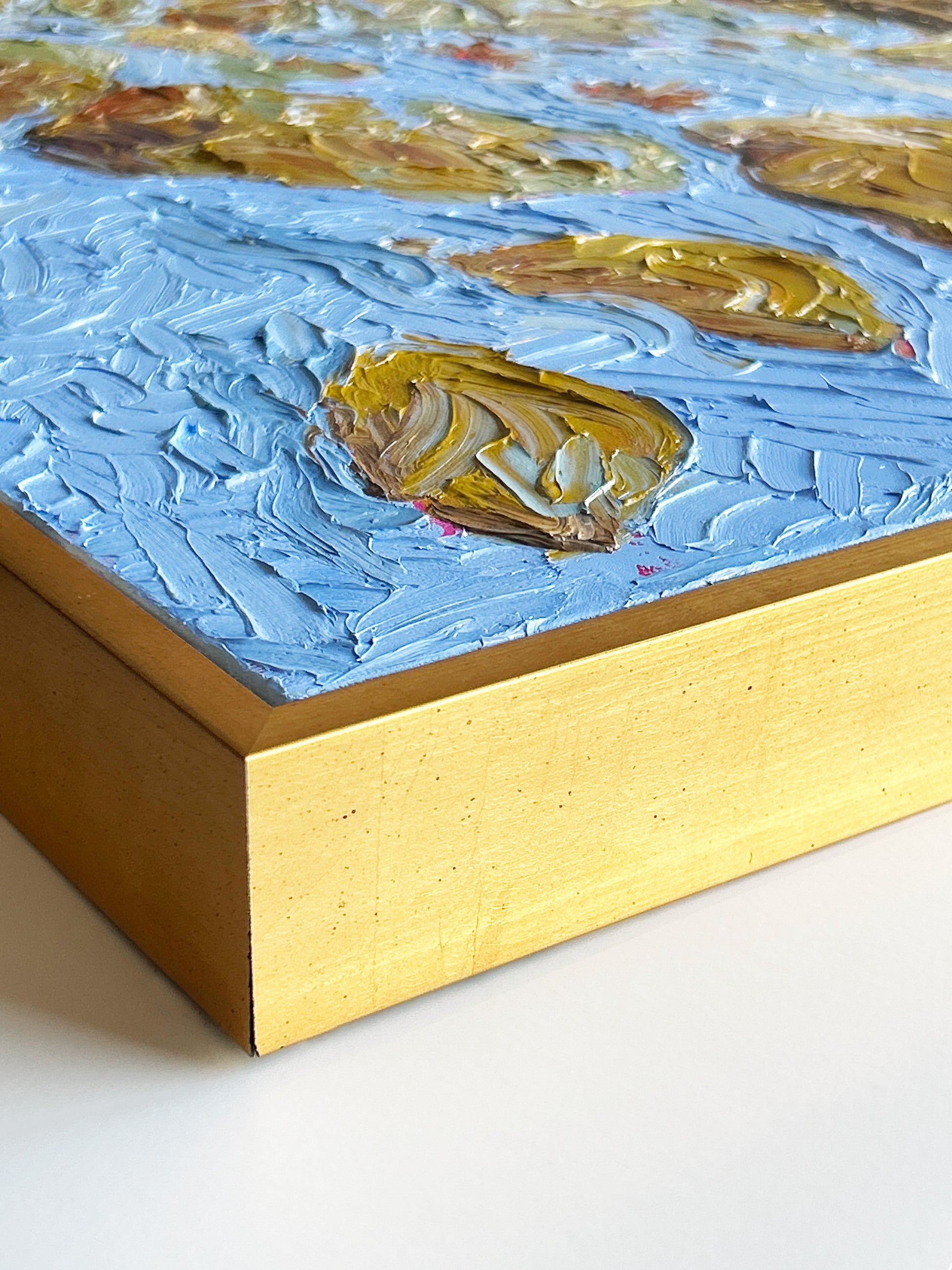 The sides of the canvas are painted as a wrap-around continuation of the painting. Arrives ready to hang in a gold floater frame selected by Iris.