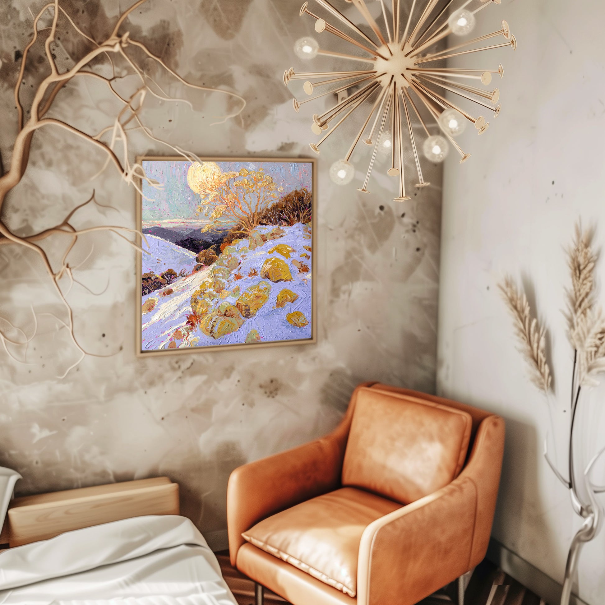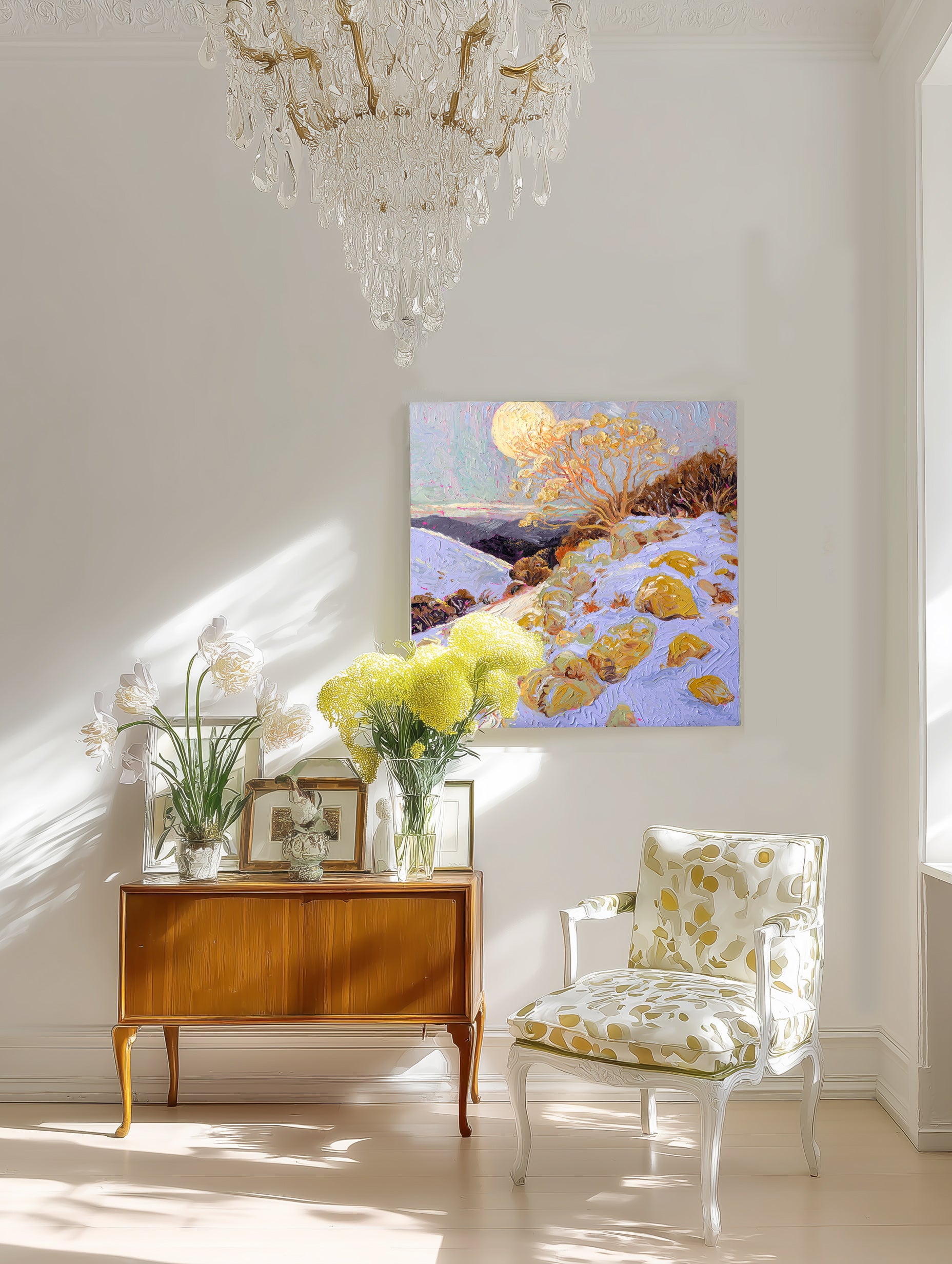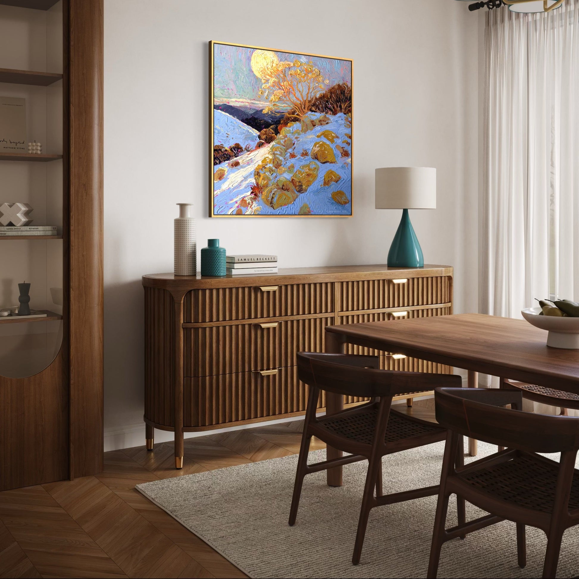 A colossal harvest moon rises over a hush of snow. The golden tips of a winter tree dissolve into the moon’s radiance, vanishing into its luminous embrace. Coral light slicks across the bark, while thick ribbons of shadow zigzag through drifts of paint—grooved and glacial, alive with movement.