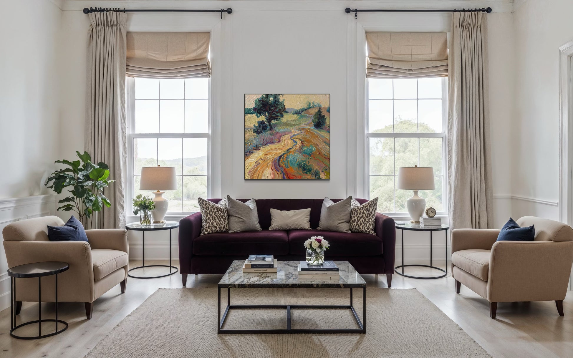 Many hikers claim it has otherworldly multidimensional energies. Originating in the medieval era, this ancient pathway was once a vital artery for trade and pilgrimage, connecting vibrant towns and diverse landscapes. Its scenic charm, from rolling hills and sun-drenched plains to charming villages and dramatic vistas, evokes the romantic allure that captivated post-impressionist artists. Note Iris’s thickly finger painted grooves in the bottom left quadrant, imagine how wooden wheels must be responsible for these deeply cut ruts in the road. The tracks of oil texture invite the viewer to meander forward, like a river flowing into the future.