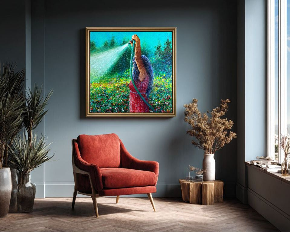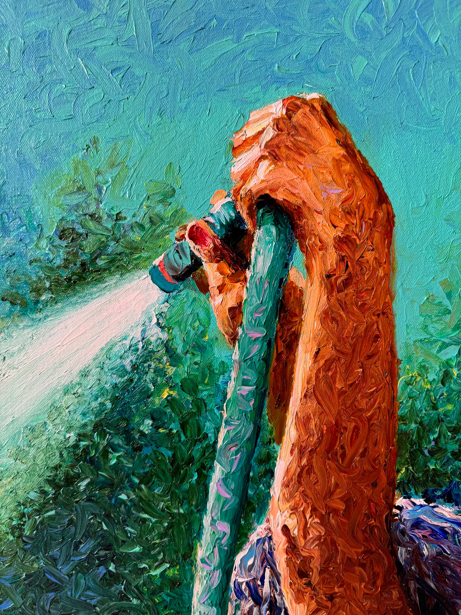 Finger painting was still new to Iris then, and this piece shimmers with the early twinkling stroke-work that would come to define her art for the next decade. Thick with oil texture, the spray of water from the hose is built from tiny, sharp dabs of white, each one rising to a delicate point like a Hershey’s Kiss. Countless little marks make up the surface of the painting—run your hands along the leaves and petals and you can feel the thousands of quiet decisions a young artist made in a small spare bedroom, deep in a basement, at a moment when she had no idea whether she would ever truly get to paint for a living