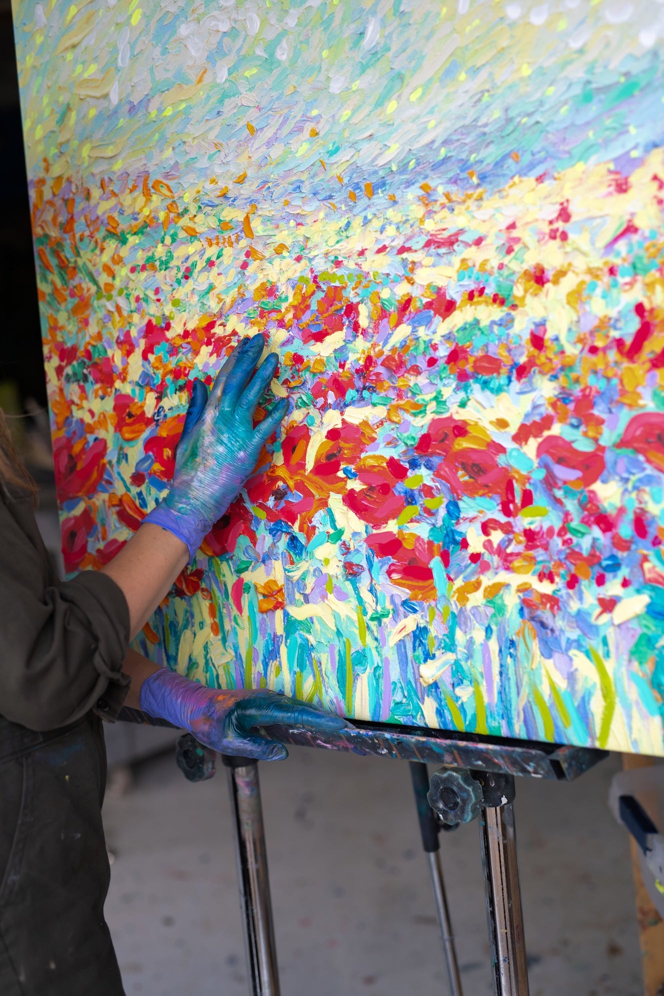 Limited Edition Embellished Giclée Canvases are now available for fine art collectors. Iris Scott paints onto the surface of the giclée with hundreds of dabs of thick texture and color to create a unique print. The artwork includes a signed and numbered certificate of authenticity, and each image is restricted to just 20 embellished prints. USA orders arrive stretched and ready-to-hang on 1.5 inch depth wooden stretcher bars. Hardware included. Please Note: All Limited Editions shipped outside the USA will ship rolled, and should be stretched at your local frame shop.