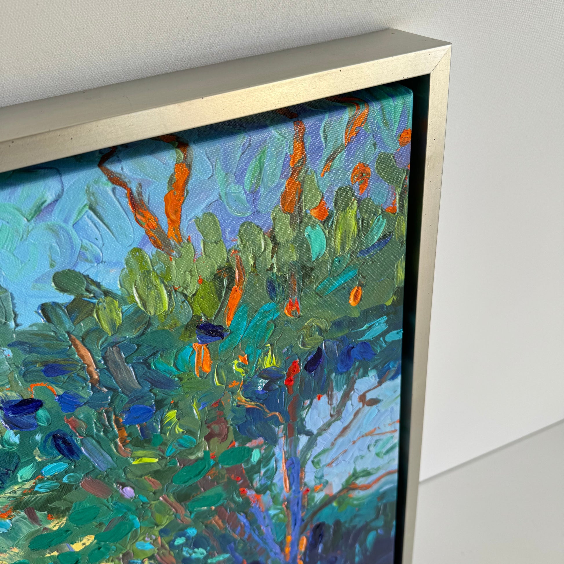 Elegantly framed in a silver floater frame.