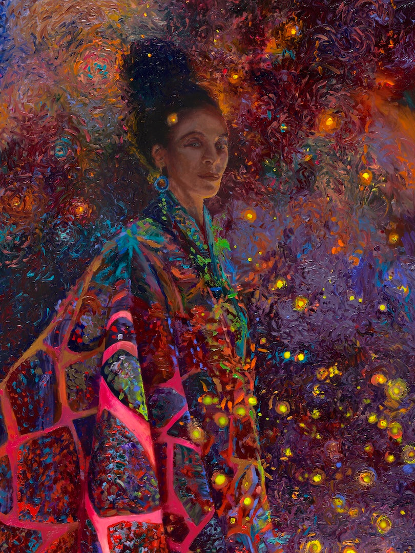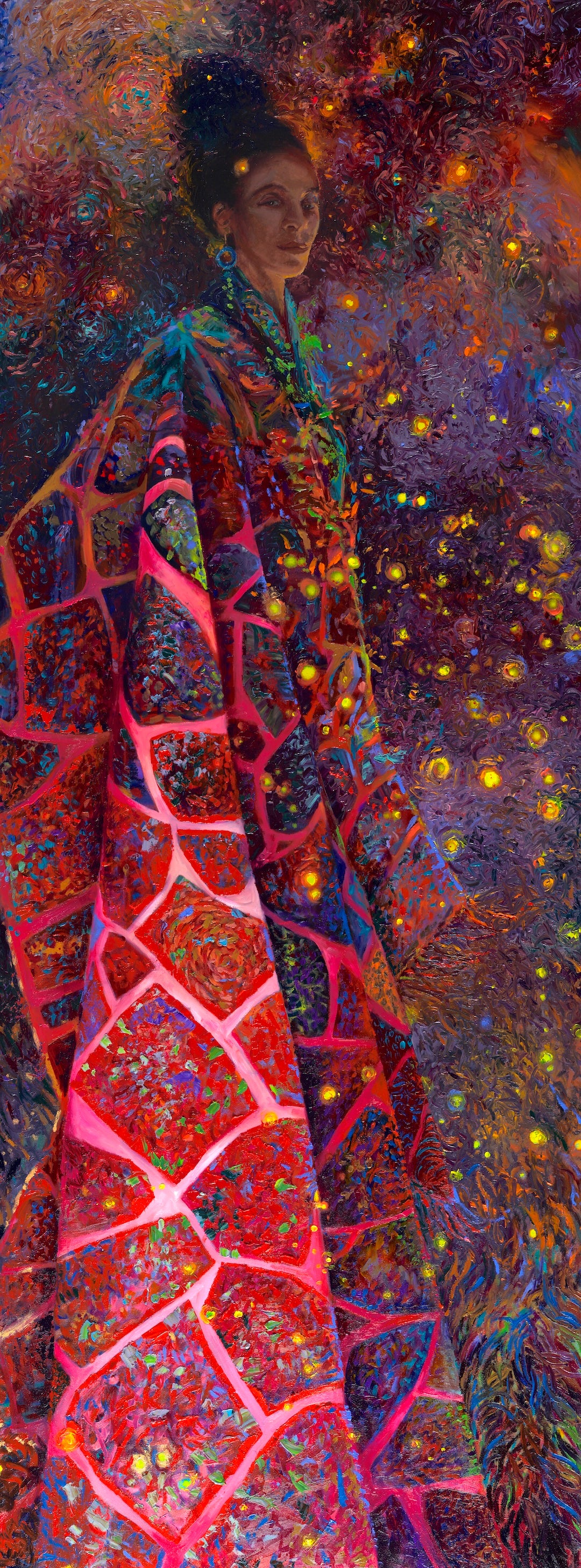 Finished in late 2018, this was the first of the tall narrow portraits that are finger paintings with brush painting on the skin. The garment was inspired by looking at draped fabric I constructed in the studio out of pieces of my older work. The model appeared in my life serendipitously, cosmic forces helped connect us. I loved how her features looked a touch Egyptian, chiseled, and a blend of races. For me this painting is a scene from the future, a portrait perhaps that happens in 2300.