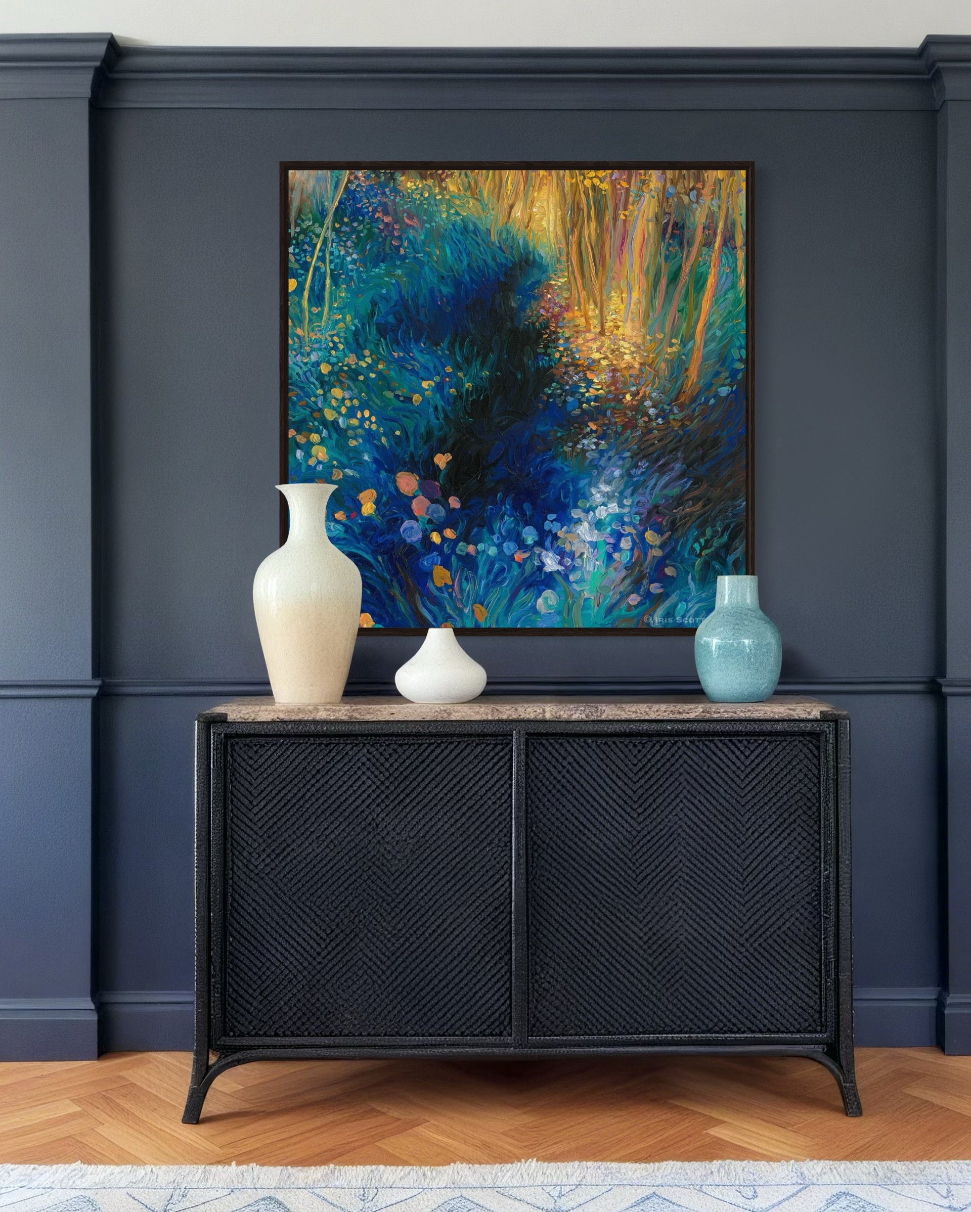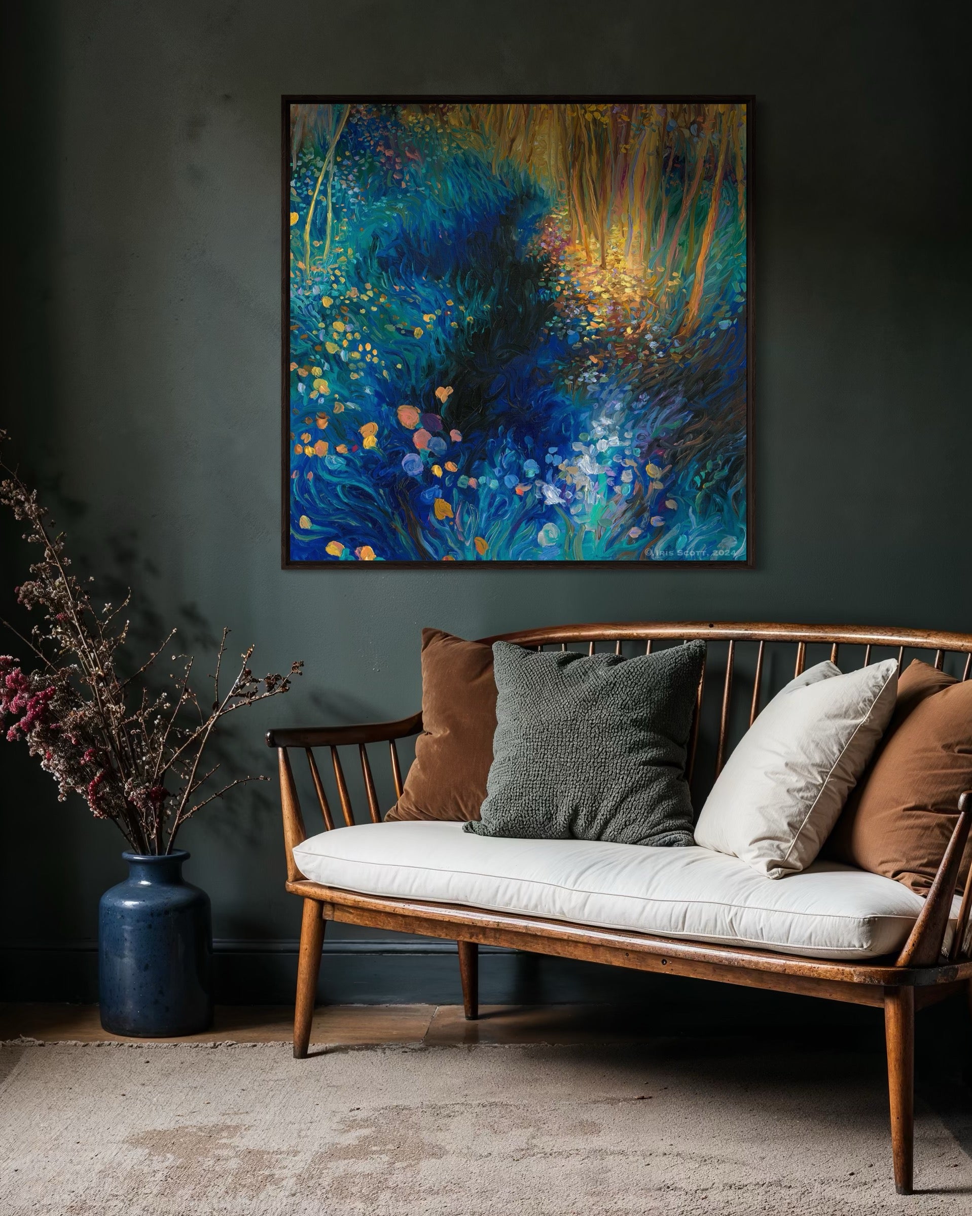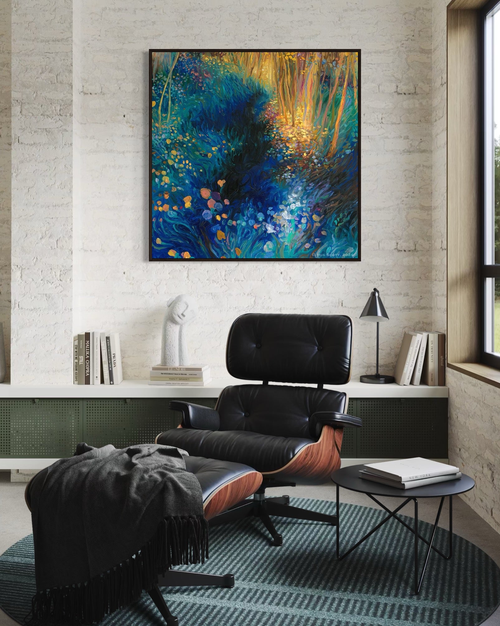 The cobalt and turquoise grasses verge on the surreal, yet the scene retains a grounded sense of place. Painted with a post-impressionistic sensibility, the golden leaves and scattered blossoms in the foreground are distilled into simplified forms, allowing color and composition to speak more to mood than to strict representation.