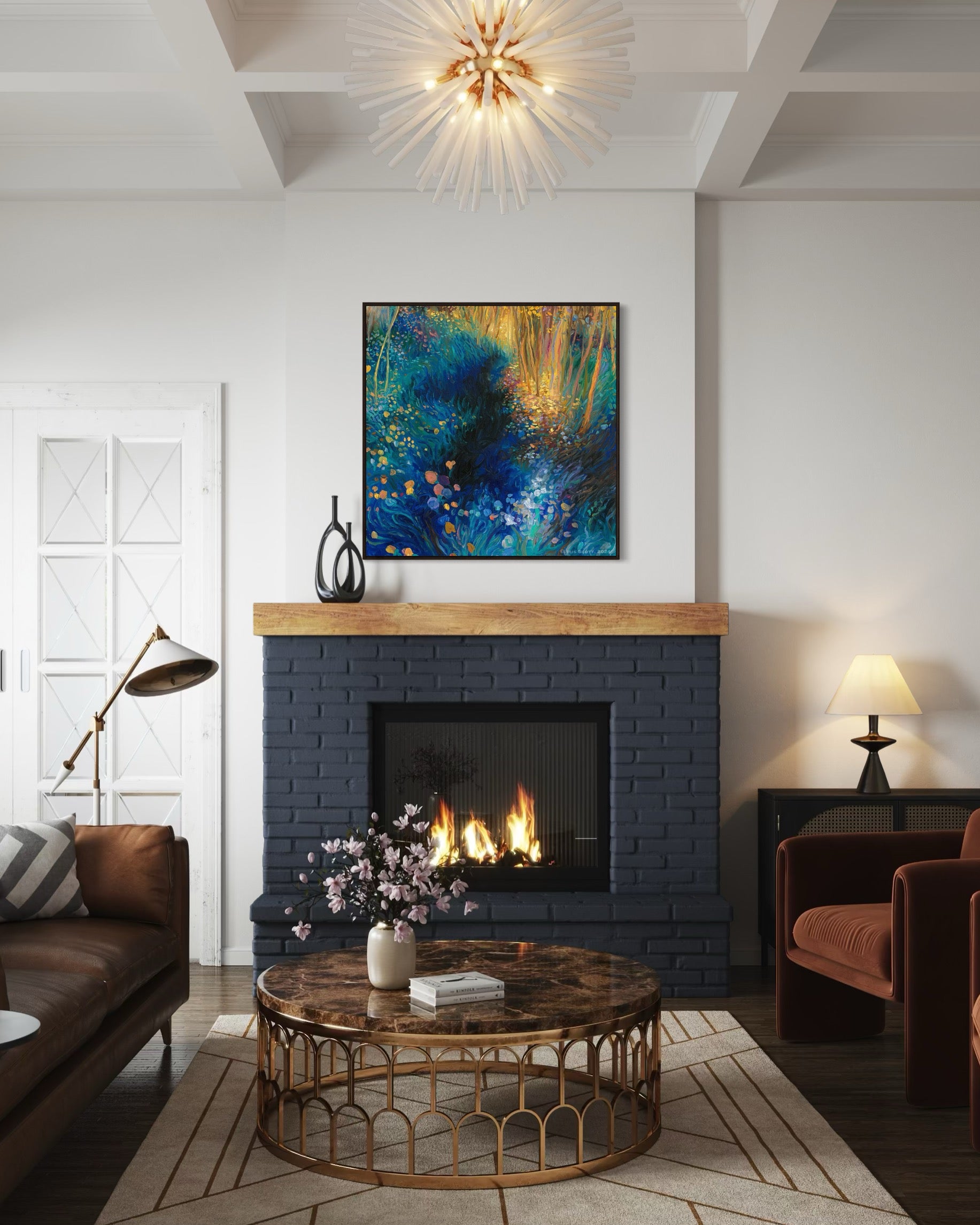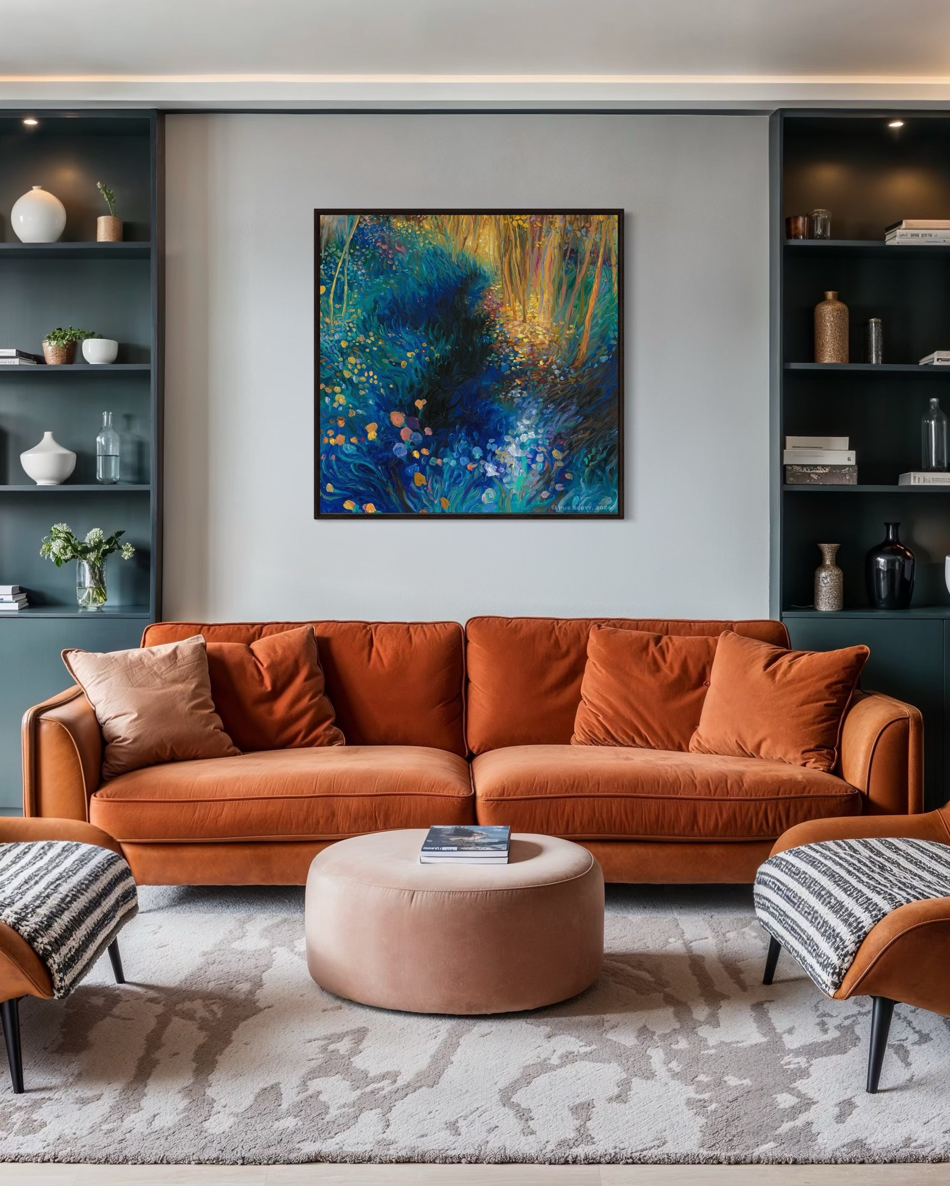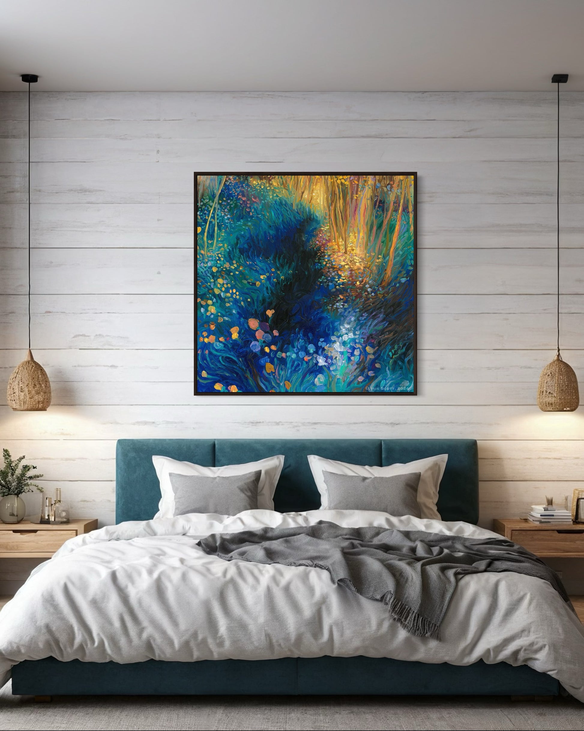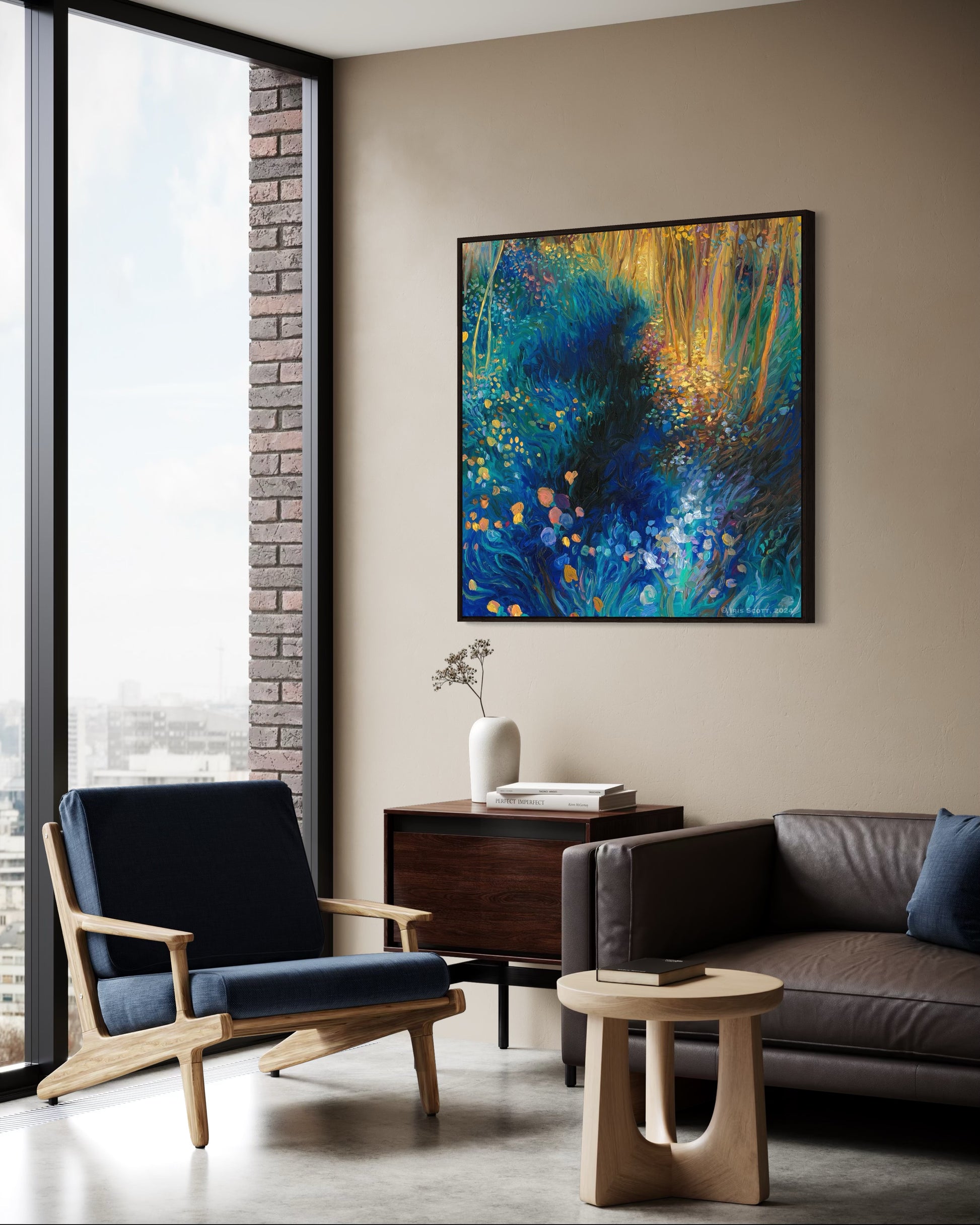 The cobalt and turquoise grasses verge on the surreal, yet the scene retains a grounded sense of place. Painted with a post-impressionistic sensibility, the golden leaves and scattered blossoms in the foreground are distilled into simplified forms, allowing color and composition to speak more to mood than to strict representation.