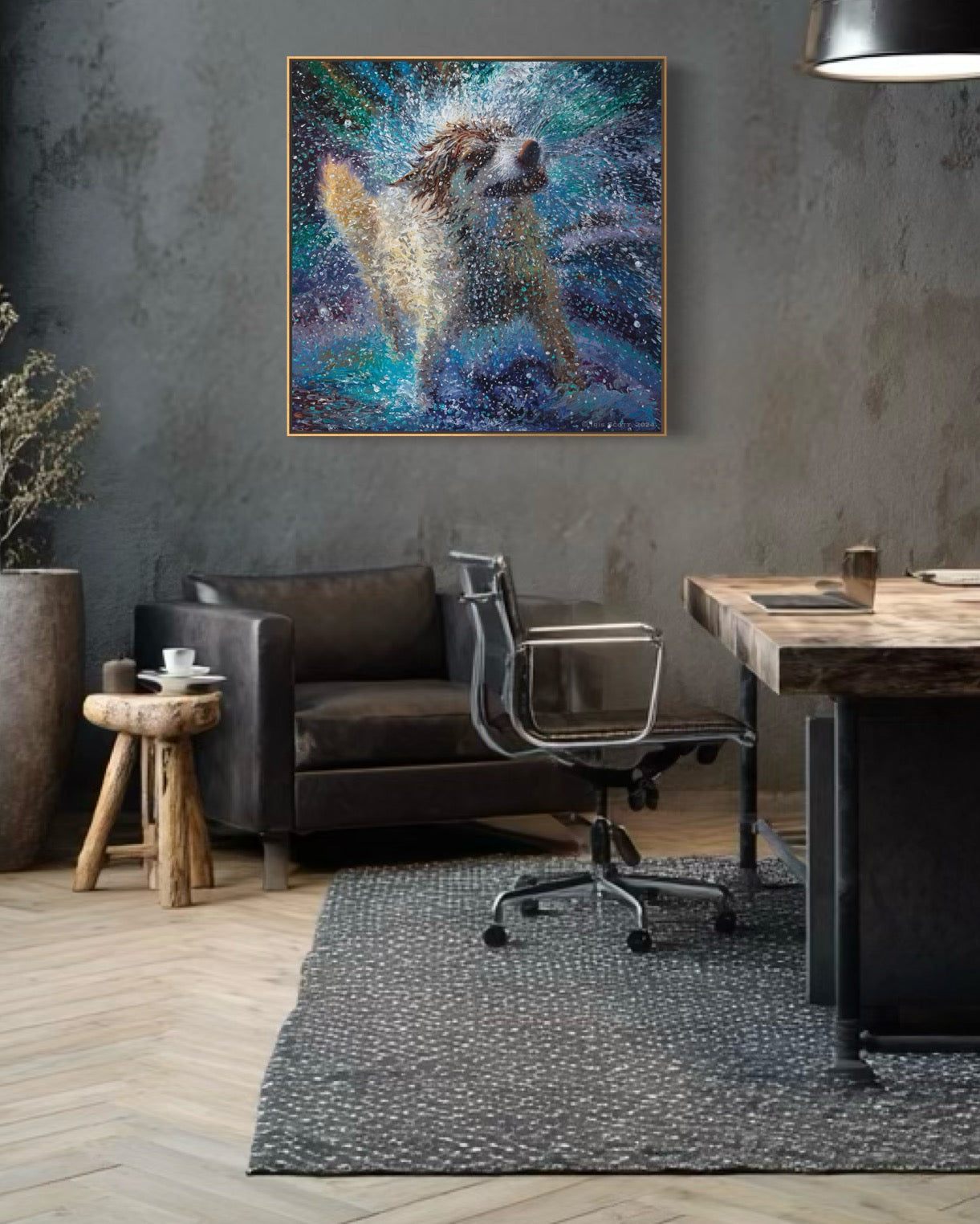 This painting captures Jackson, a Husky with the heart of a lone wolf, mid-spin as he shakes off icy river water in a display of raw strength. Thick oils, applied entirely by hand, create a bold, textured surface that mirrors his rugged, untamed spirit. Swirling blues and whites suggest the churn of freezing currents, embodying the grit and resilience of his wild ancestry. The loose, abstract forms highlight Jackson’s tough, no-nonsense nature—a blend of raw power and primal instinct, distilled into a single, electrifying moment.