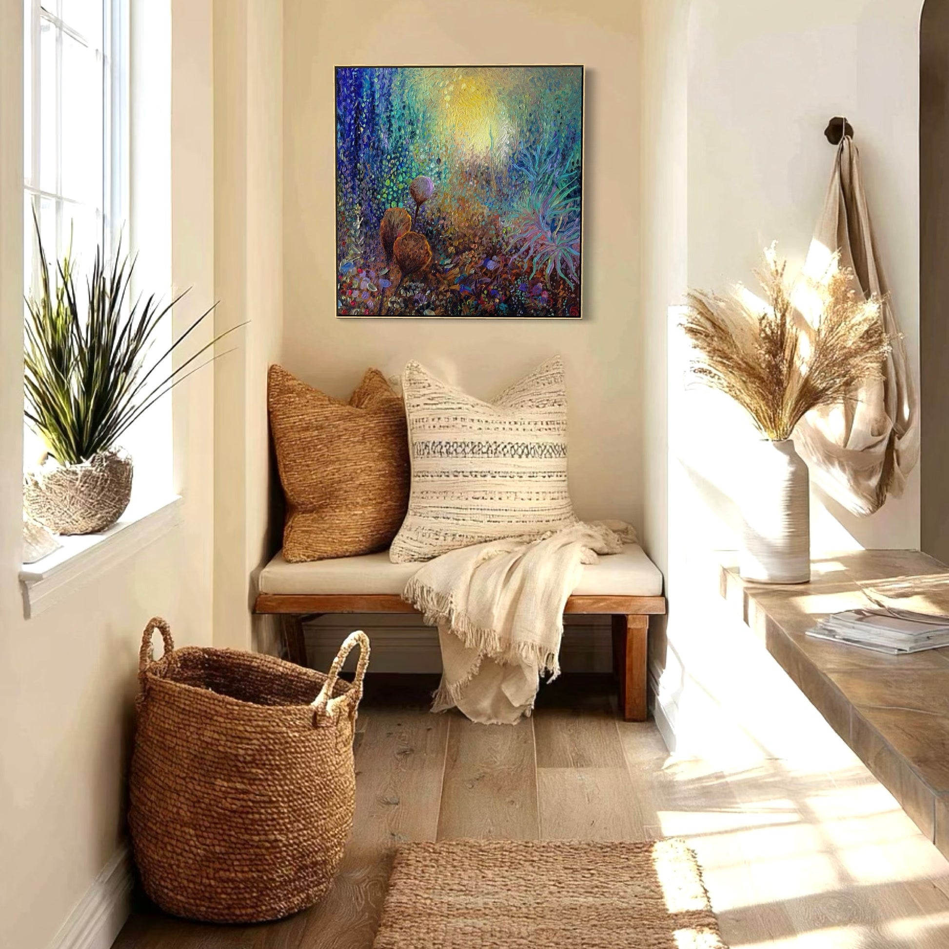The sides of the canvas are painted as a wrap-around continuation of the painting. Arrives ready to hang or frame.