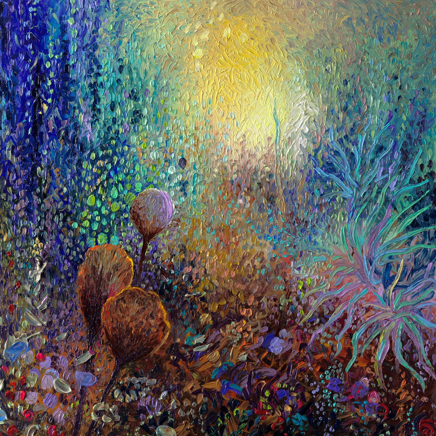 The painting centers on three cacti-like forms in the foreground and yucca shapes to the right, while a distant botanical spire stands in quiet silhouette against a radiant horizon. Desert and seabed collapse into one another through a spectrum of aqua, earth tones, lavender, turquoise, teal, and burnt sienna, all held within a soft, atmospheric vignette. The surface rises in sculptural ridges—oil built nearly half an inch deep—inviting the viewer to read the terrain as both eroded landscape and submerged reef. Finger-painted strokes braid across the canvas like shifting underwater currents, suggesting a world where arid heat and tidal motion coexist in the same breath.