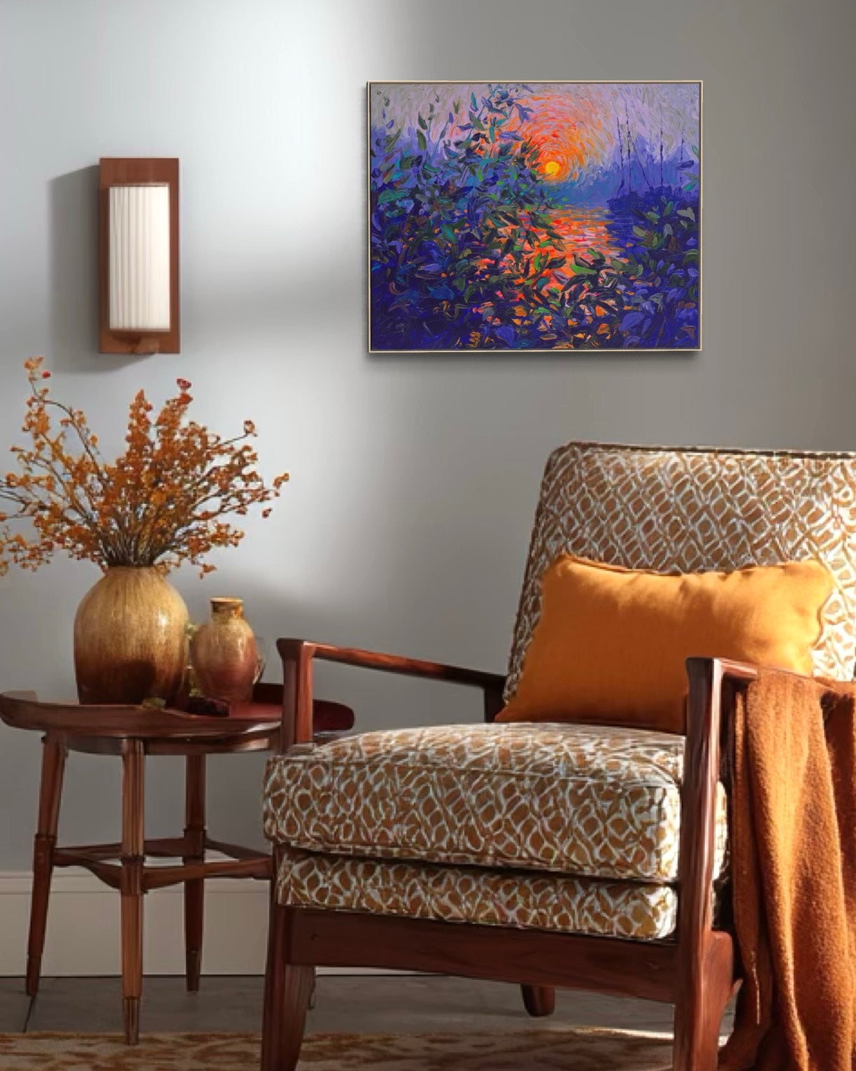 The sides of the canvas are painted as a wrap-around continuation of the painting. Arrives ready to hang or frame.