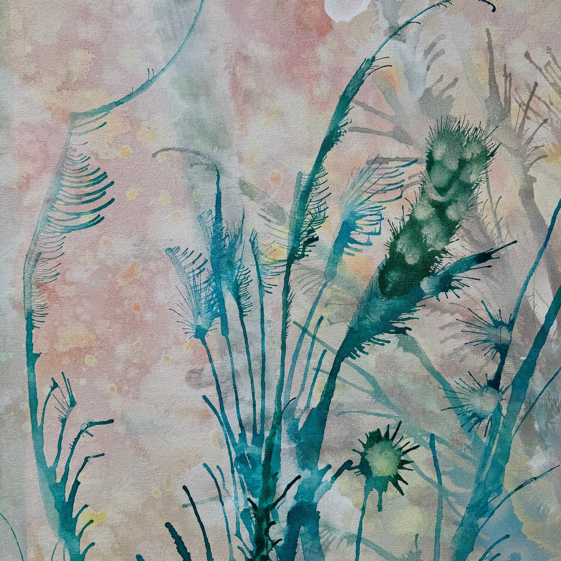 Towering six feet high and just as wide, this immense painting unfurls like a living wall of botanical power. Tendrils twist, ferns unfurl, moss and bark mingle with petal and spine. It is a garden of invention—half dream, half organism—its abstracted botany pulsing with quiet intent. The lush green forms in the foreground rise against a whispering background of pale yellow and pink, a dawn-like haze that invites the viewer inward.