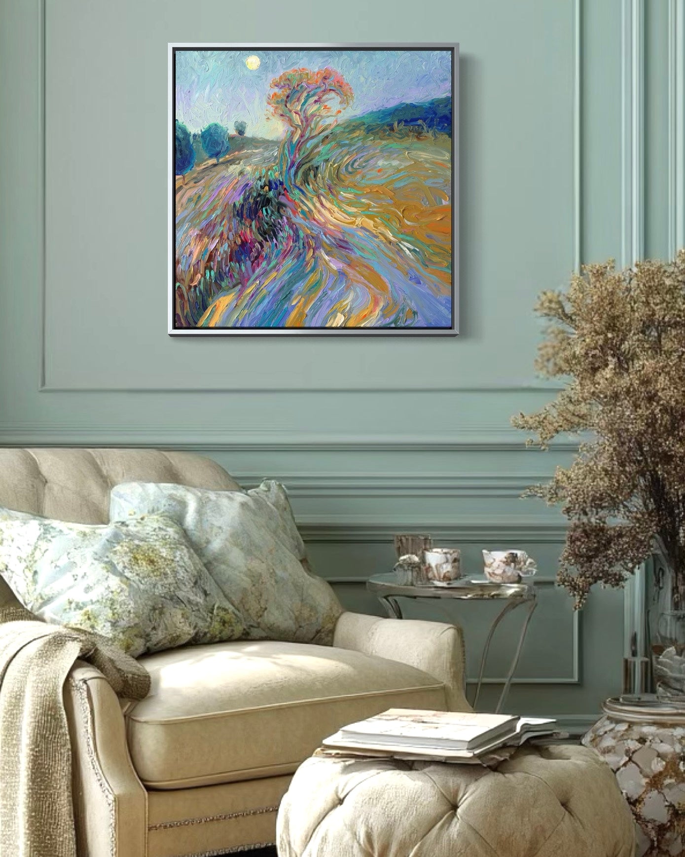 A quarter-sized moon rises over a lavender dusk, casting its cool glow on a gnarly, flame-lit tree shaped by Van Gogh–like sweeps of land. Grasses shift like windborne currents, blurring into the tree’s form in an intentionally abstracted gesture—more a meditation on paint than on landscape. Gold pigment builds sculptural ridges as blues, purples, and teal collide in wave-like motion. Three or four distant trees anchor the far horizon, and the artist’s signature is quietly incised into the dark blue foothills of the upper right.