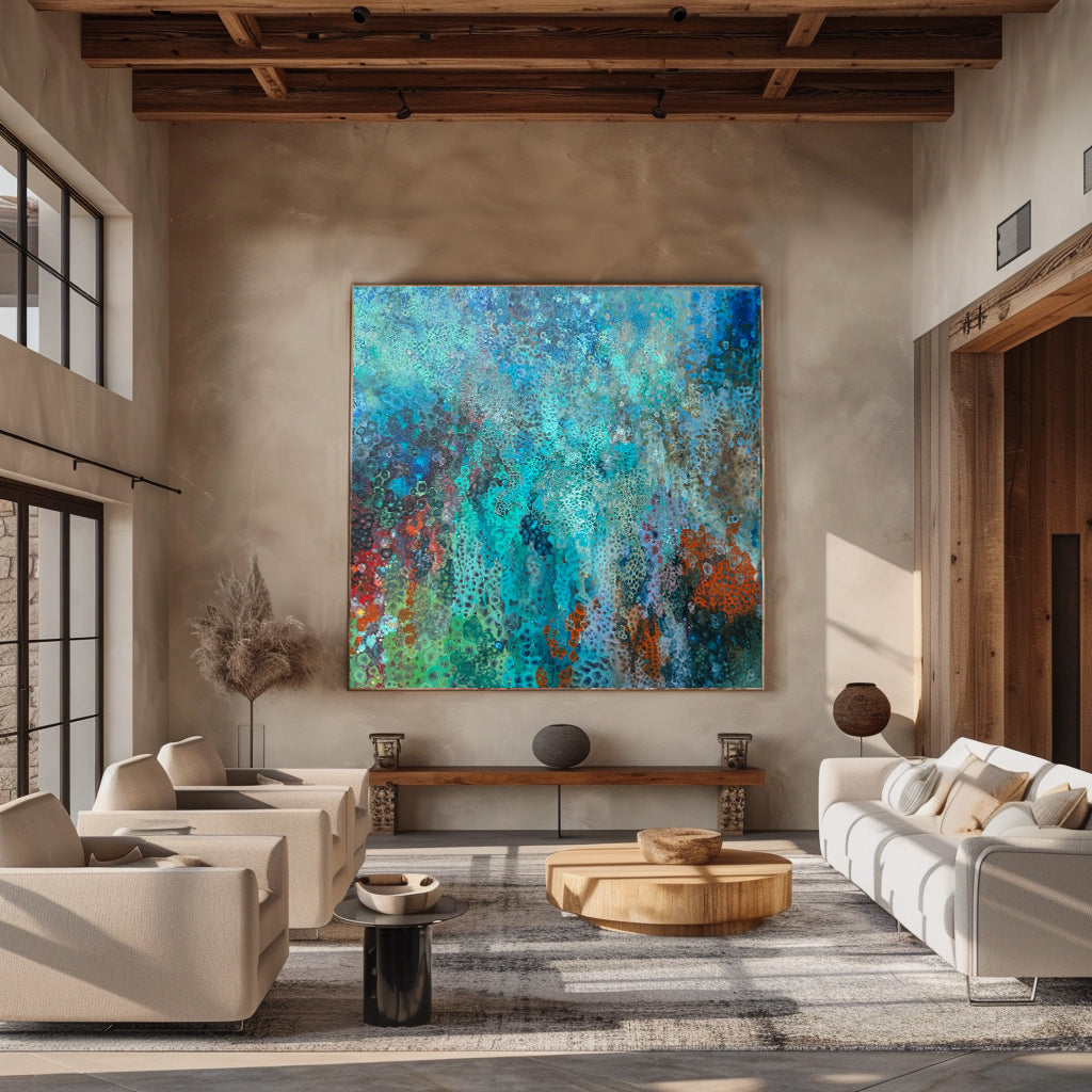 Seafoam Oracle is a vast, immersive field of oil-born cells—an oceanic vision rendered in cascading blues and deep earthen reds. The painting evokes the sensation of standing before a waterfall in motion, where water, bubbles, and mist fold into one another in a continuous, breathlike rush. Across the surface, textures reminiscent of scales catch the light, adding a subtle corporeal whisper to the composition.