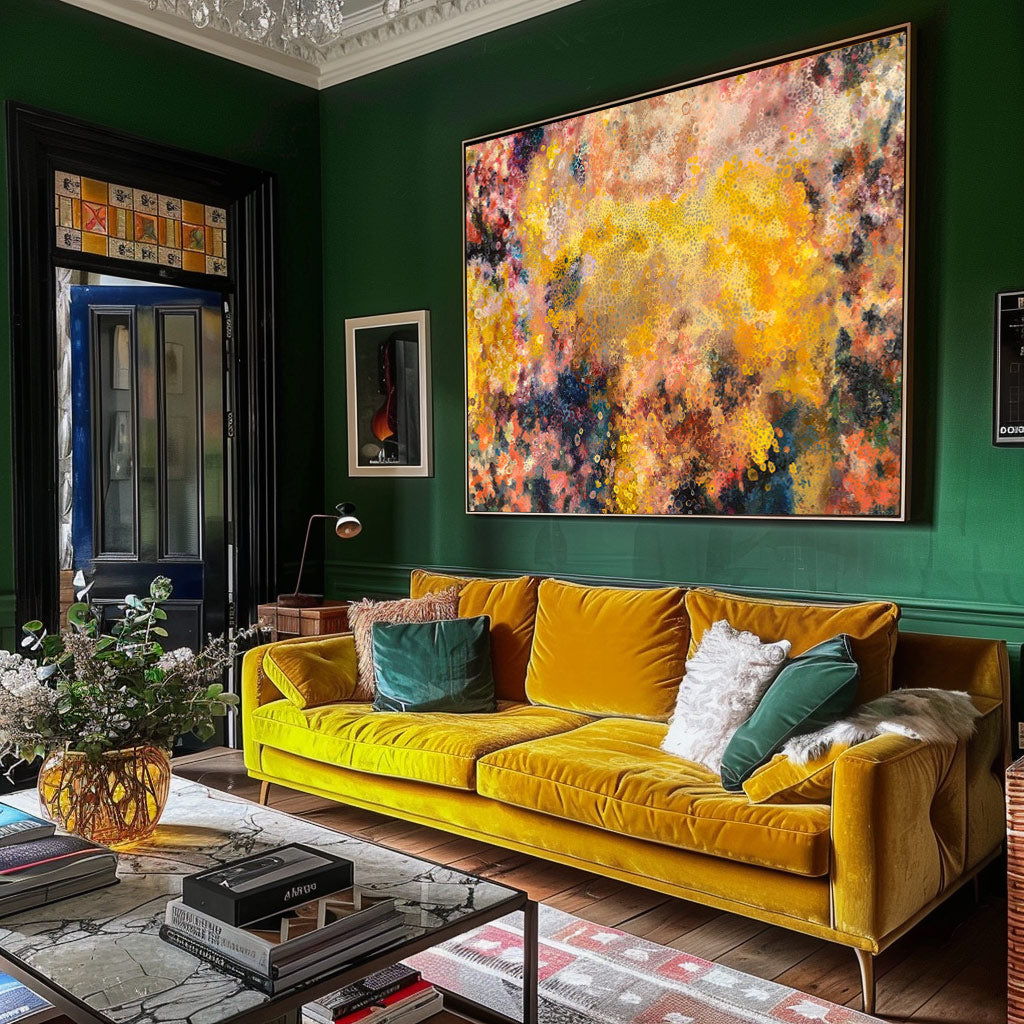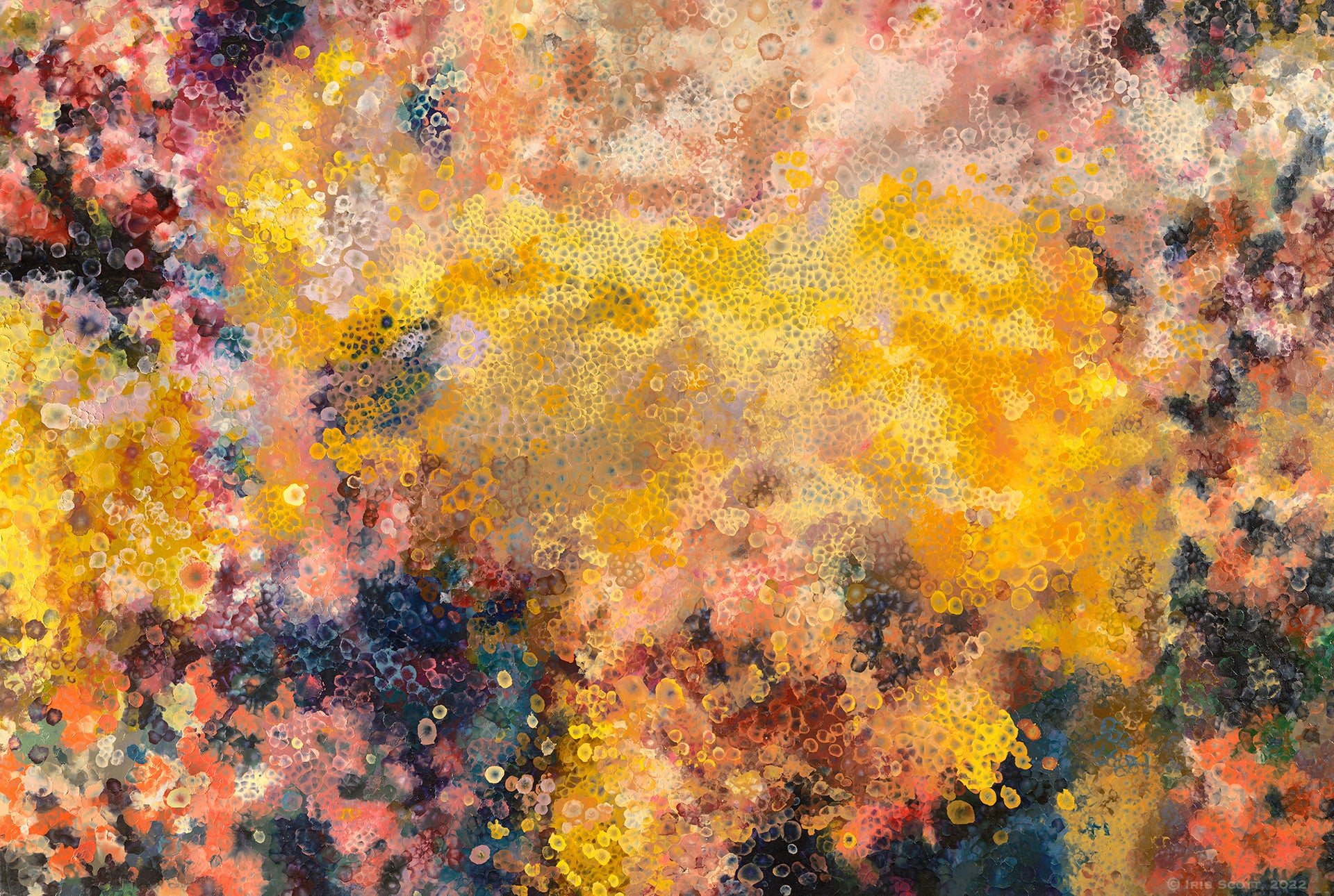 Inspired by a vivid tapestry of tulips encountered at an Amsterdam flower market, this colossal abstract unfolds in a palette woven from nature's hues. Petal-like structures cascade gracefully across our gaze, evoking a sense of organic abundance. Yet, upon investigation, the organic shapes elude the viewer, leading into abstraction, denying any clear identification—petals become scales, cells, atoms, spread ethereally like celestial bodies. Within this expansive canvas, an interplay of depths exposes a phantom elephant—or is it something else—a parade of whimsical hallucinations dance across the yellow backdrop.