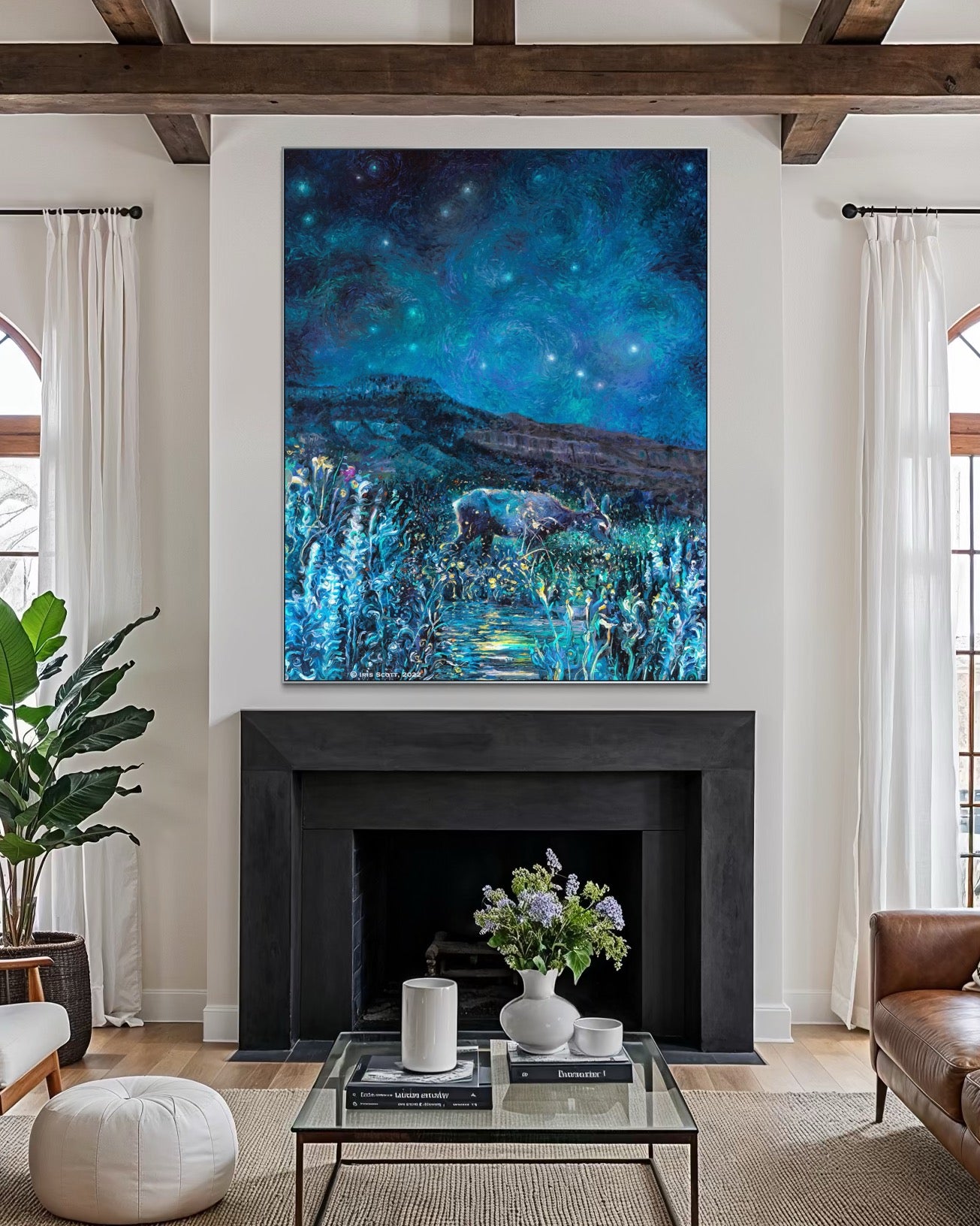 Each October and November, the Orionids arc across the night sky—brief, bright remnants of Halley’s Comet. In Under the Orionids, a single deer grazes among tall sage, a small pond reflecting the flicker of passing meteors. Behind her, Mesa Prieta rises in its true form, the same silhouette the artist sees each day from her studio windows.