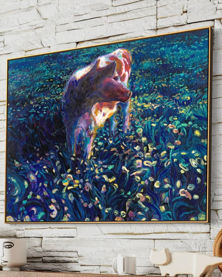 What holds her gaze? The canvas whispers secrets of New Mexico’s enchantment, echoing tales of UFO landings. Here, the artist invites you to imagine the unseen — a close encounter hovering just out of view. Is it a craft, or celestial lights? The painting leaves the enigma suspended in the night air, as the cow becomes both witness and guardian of an uncharted mystery — her serene presence grounding the extraordinary in the everyday.